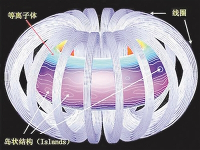 中国超导托卡马克实验装置(即Experimental Advanced Superconducting Tokamak,缩写为EAST,也被称为“东方超环”)是在真空室内加入少量氢的同位素氘或氚,通过类似变压器的原理使其产生等离子体,然后提高其密度、温度使其发生聚变反应,反应过程中会产生巨大能量。其原理在本质上与太阳核聚变相似,因而,“东方超环”也被誉为中国的“人造太阳”。