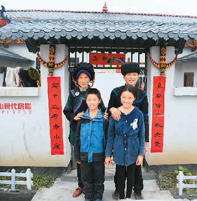| 东西部扶贫协作推动区域协调发展。图为6月19日四川凉山州申果乡达布村贫困户阿牛尔铁一家在易地搬迁后的新居前合影。 |