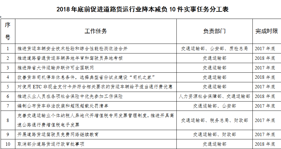 2018年底前,完成降本减负10件实事(见附件),推动政策落地并取得实质性进展。制度性交易成本大幅降低,货车司机生产生活条件显著改善,货运业户的获得感和货车司机的归属感持续增强,行业平稳发展的基础更加牢固。