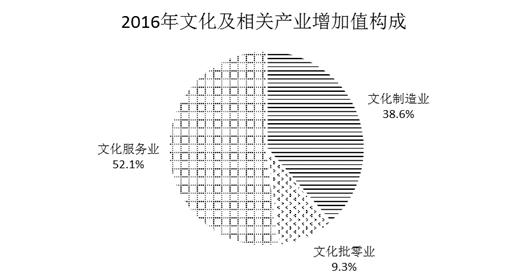 按行业分,2016年文化制造业增加值为11889亿元,比上年增长7.6%,占文化及相关产业增加值的比重为38.6%;文化批发零售业增加值为2872亿元,增长13.0%,占9.3%;文化服务业增加值为16024亿元,增长17.5%,占52.1%。