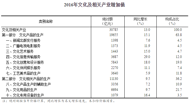 数据显示,根据《文化及相关产业分类(2012)》和《文化及相关产业增加值核算方法》的规定和要求,经核算,2016年全国文化及相关产业增加值为30785亿元,比上年增长13.0%(未扣除价格因素,下同),比同期GDP名义增速高4.4个百分点;占GDP的比重为4.14%,比上年提高0.17个百分点。2016年文化及相关产业保持平稳快速增长,比重稳步上升,对促进经济转型升级、平稳健康可持续发展发挥了重要作用。