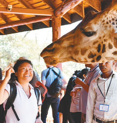 | 近年来,春节期间前往非洲旅游的中国游客逐渐增多。今年春节期间,在肯尼亚首都内罗毕的长颈鹿中心,一名中国游客和长颈鹿互动。 |