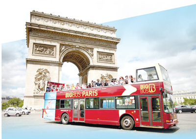 | 在法国巴黎,一辆观光巴士经过凯旋门。 |