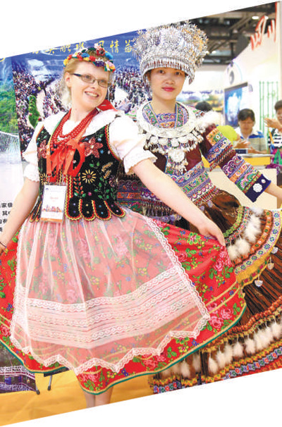 | 在2017北京国际旅游博览会上,来自波兰的安娜(左)和来自广西柳州市融水苗族自治县的张凤媚合影留念。 |