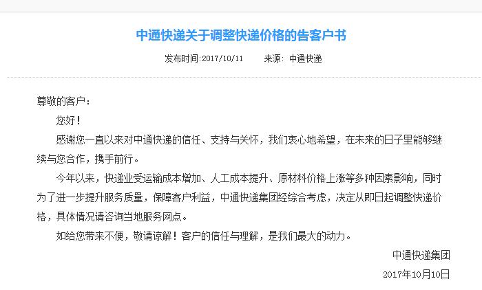 而中通快递于10月10日也公布涨价讯息,官网刊文称,中通快递集团经综合考虑,决定从即日起调整快递价格,具体情况请咨询当地服务网点。