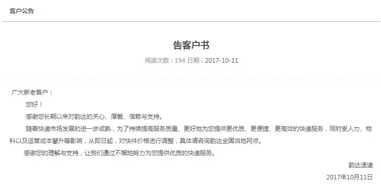 10月11日,韵达快递官网发布《告客户书》,表示为提供更优质、更便捷、更高效的快递服务,同时受人力、物料以及运营成本攀升等影响,从即日起,对快件价格进行调整,具体请咨询韵达全国当地网点。