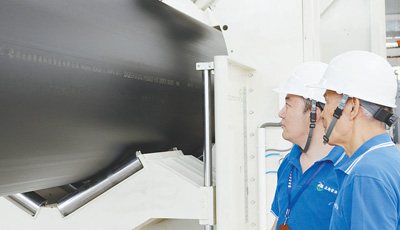 | 泉恩管业工作人员正在查看大口径PE生产线激光喷码作业。 |