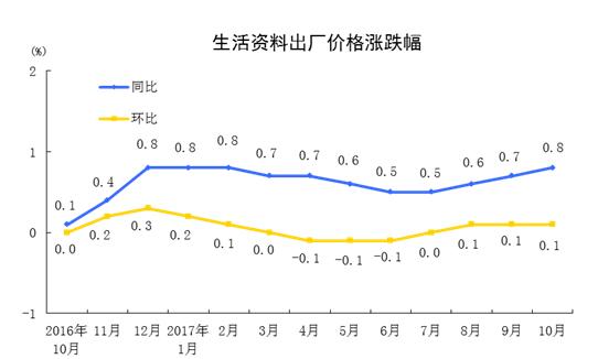 人民网北京11月9日电(李楠桦)国家统计局官方网站公布数据显示,2017年10月份,全国工业生产者出厂价格同比上涨6.9%,环比上涨0.7%。工业生产者购进价格同比上涨8.4%,环比上涨0.9%。1-10月平均,工业生产者出厂价格同比上涨6.5%,工业生产者购进价格同比上涨8.4%。