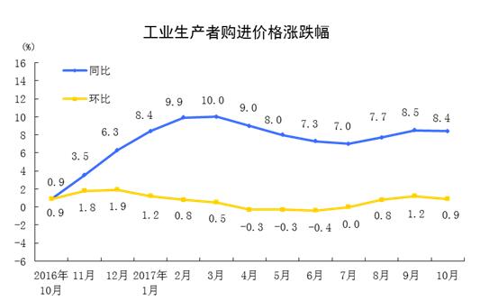 人民网北京11月9日电(李楠桦)国家统计局官方网站公布数据显示,2017年10月份,全国工业生产者出厂价格同比上涨6.9%,环比上涨0.7%。工业生产者购进价格同比上涨8.4%,环比上涨0.9%。1-10月平均,工业生产者出厂价格同比上涨6.5%,工业生产者购进价格同比上涨8.4%。qYM安康新闻网