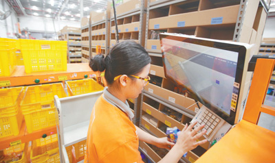 图为11月12日,在菜鸟网络广东惠阳超级机器人仓,工作人员正在操纵机器人分拣线。以往一个拣货员一天走六七万步只能拣货1000多件,在机器人的帮助下,一个拣货员一天只走两三千步,拣货数量却是原来的3倍多。 |