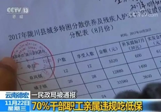 德宏州纪委通报,陇川县民政局长期以来对申请享受低保人员抽查、核实、公示把关不严、监管缺失,70%以上干部职工亲属违规享受低保,把服务群众的权力当作亲属获利的“工具”。