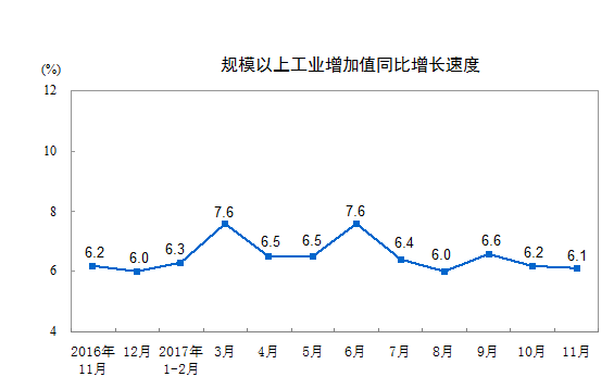 人民网北京12月14日电(记者李楠桦)据国家统计局官方网站消息,2017年11月份,规模以上工业增加值同比实际增长6.1%(以下增加值增速均为扣除价格因素的实际增长率),比10月份回落0.1个百分点。从环比看,11月份,规模以上工业增加值比上月增长0.48%。1-11月份,规模以上工业增加值同比增长6.6%。