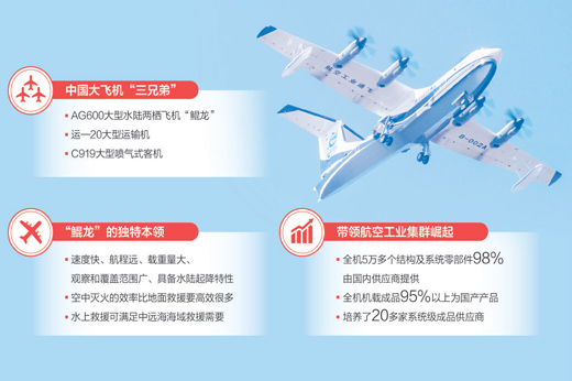 近日,AG600大型水陆两栖飞机“鲲龙”首飞成功,党中央、国务院发贺电表示热烈的祝贺和亲切的慰问。AG600与运—20大型运输机、C919大型喷气式客机一起,被称为中国大飞机“三兄弟”。