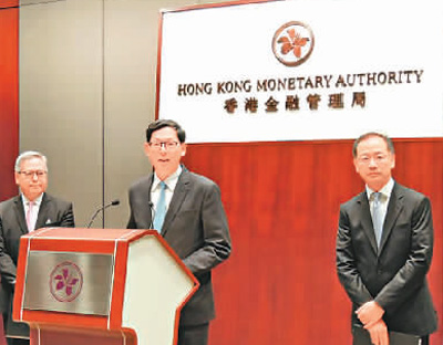 | 香港金融管理局总裁陈德霖(中)在介绍外汇基金投资回报情况。 |