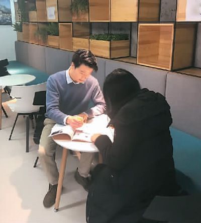 图为陈戈(左)与同事探讨关于留学生二手交易中存在问题的调研结果。