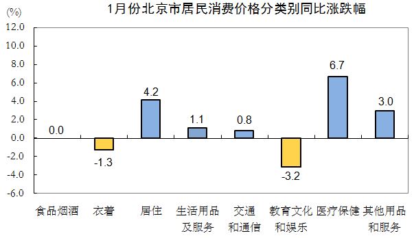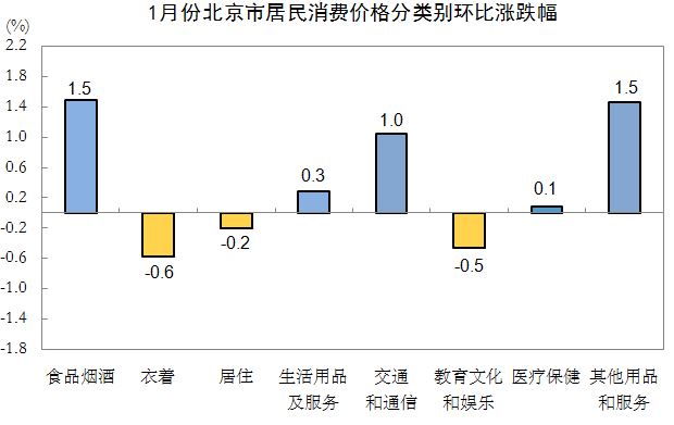 1月份,北京市居民消费价格总水平环比上涨0.4%。其中,食品价格上涨2.0%,非食品价格上涨0.1%;消费品价格上涨0.6%,服务价格上涨0.1%。