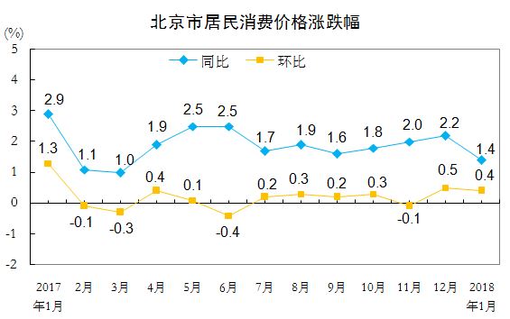 人民网北京2月13日电 据北京市统计局网站消息,国家统计局北京调查总队、北京市统计局日前公布2018年1月份北京市居民消费价格变动情况。2018年1月份,北京市居民消费价格总水平同比上涨1.4%。其中,食品价格下降1.5%,非食品价格上涨2.0%;消费品价格下降0.2%,服务价格上涨3.7%。