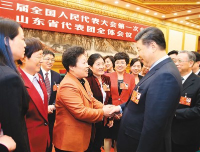 | 3月8日,中共中央总书记、国家主席、中央军委主席习近平参加十三届全国人大一次会议山东代表团的审议。在“三八”国际劳动妇女节到来之际,习近平代表党中央,向参加全国两会的女代表、女委员、女工作人员,向全国各族各界妇女同胞,致以节日的祝贺和诚挚的祝福。图为习近平同女代表亲切交谈。 |