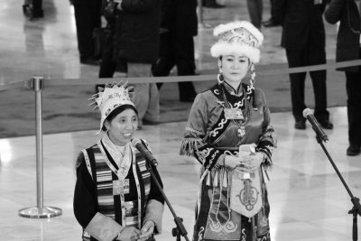 藏族代表卓嘎(左)与赫哲族代表刘蕾在“代表通道”接受中外媒体记者采访。