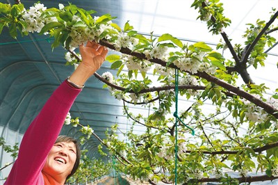 | 山东荣成市近年大力发展高效农业和生态扶贫产业项目,全市大樱桃种植发展上千亩。3月7日,在荣成市石岛管理区产业扶贫项目龙山湖生态采摘园一家樱桃大棚里,果农正在给樱桃树压枝疏花,鲜花深处乳果凸现。 |