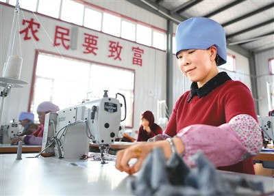 | 宁夏吴忠市同心县河西镇旱天岭村村民在村里的“扶贫车间”参加服装加工技能培训(2017年12月21日摄)。这座新落成的“扶贫车间”可解决本村上百名建档立卡贫困妇女的就业问题。 |