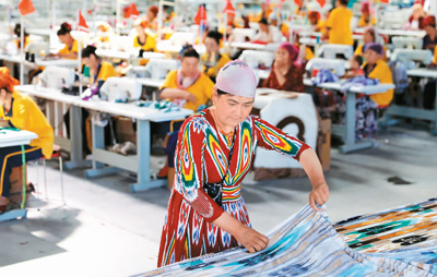 | 新疆喀什市乃则尔巴格镇的海仁古丽·居玛在镇上妇女创业脱贫基地的缝纫企业里裁剪布料(二〇一七年六月三十日摄)。在广东援疆资金支持建设下,乃则尔巴格镇逐步成为更宜居宜业的美好家园。 |