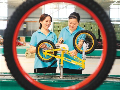 | 河北省邱县鼓励当地劳动密集型企业在农村建立“扶贫驿站”,帮助农村贫困群众在家门口就业。图为工人在邱县一家自行车生产企业在该县聂楼村设立的“扶贫驿站”内组装自行车(2017年7月16日摄)。 |