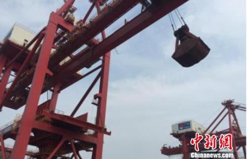 图为散货船进行铁矿砂装卸作业。杭州海关供图