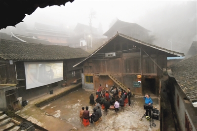 | 在南康侗寨的一户村民家门口,有一块大约半个篮球场大的晒谷场空地,肖锦生取出长绳往门楣上挂去,然后拉直、打结、绑紧,不到十分钟,一张大银幕挂了起来。在确定电影机位后,他娴熟地架起放映机,接电源、调试音响,认真地操作着每一个环节。 |