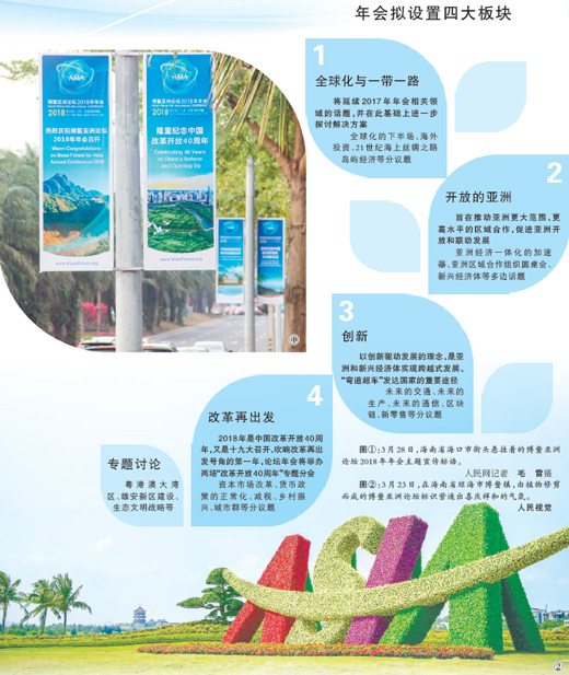 博鳌亚洲论坛2018年年会将于4月8日至11日举行,主题为“开放创新的亚洲 繁荣发展的世界”。年会将聚焦改革、开放、创新以及全球化和“一带一路”等议题,为亚洲的进一步开放、联动、创新发展建言献策,为世界经济稳步复苏凝心聚力
