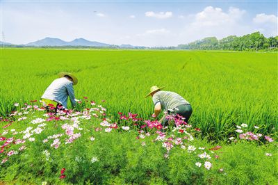 4月2日,博鳌国家农业公园内,繁花盛开,水稻郁郁葱葱,农户在地里忙碌着。本报记者 袁琛 摄