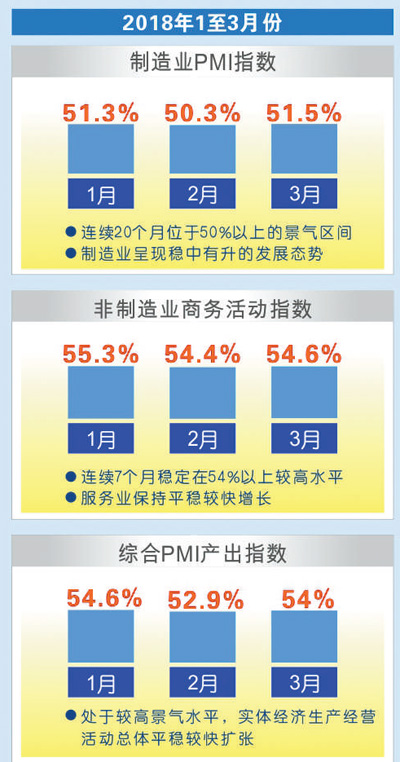 今年以来,面对错综复杂的国际国内环境,各地区各部门认真贯彻党中央决策部署,坚持稳中求进工作总基调,不断深化改革开放,有效激发内生动力和活力。从作为先行指标的1—3月份采购经理指数看,中国经济延续了去年以来稳中向好发展态势,发展预期稳定向好。