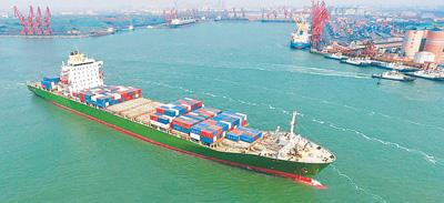 4月9日,一艘轮船驶往唐山港京唐港区集装箱码头。新华社记者 杨世尧摄