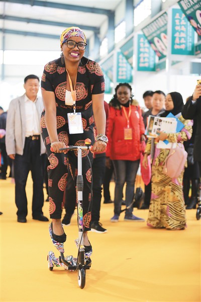 图为日前在平乡县举办的国际自行车童车玩具博览会上,一名外商开心地试骑一款儿童脚踏车。GH4安康新闻网