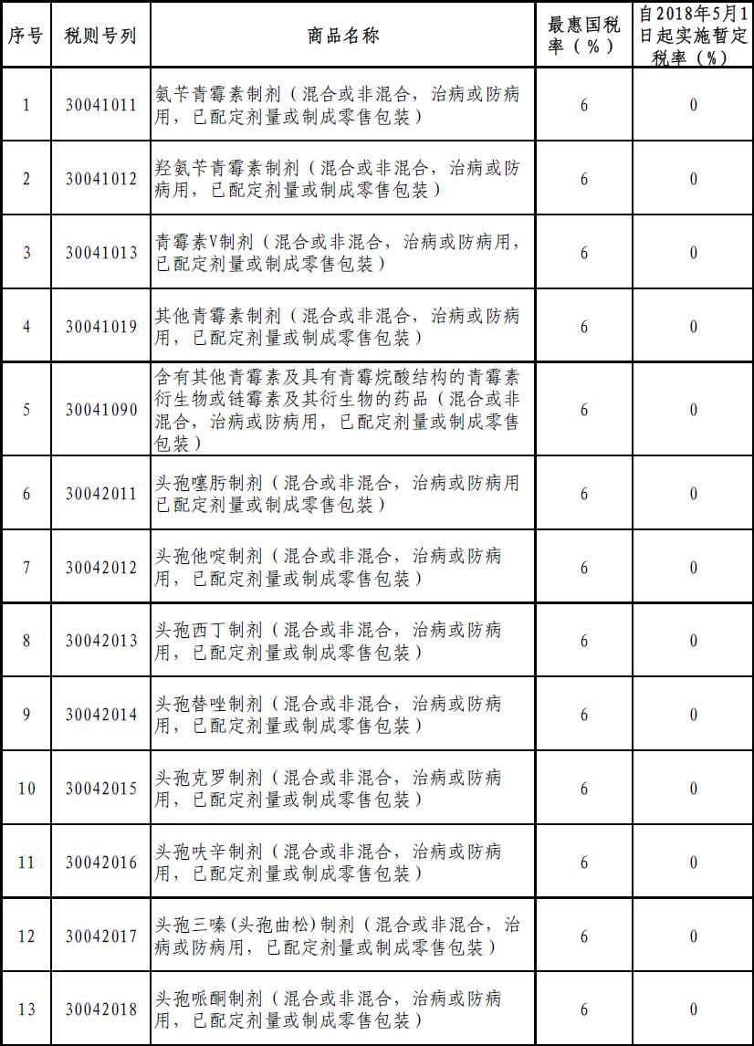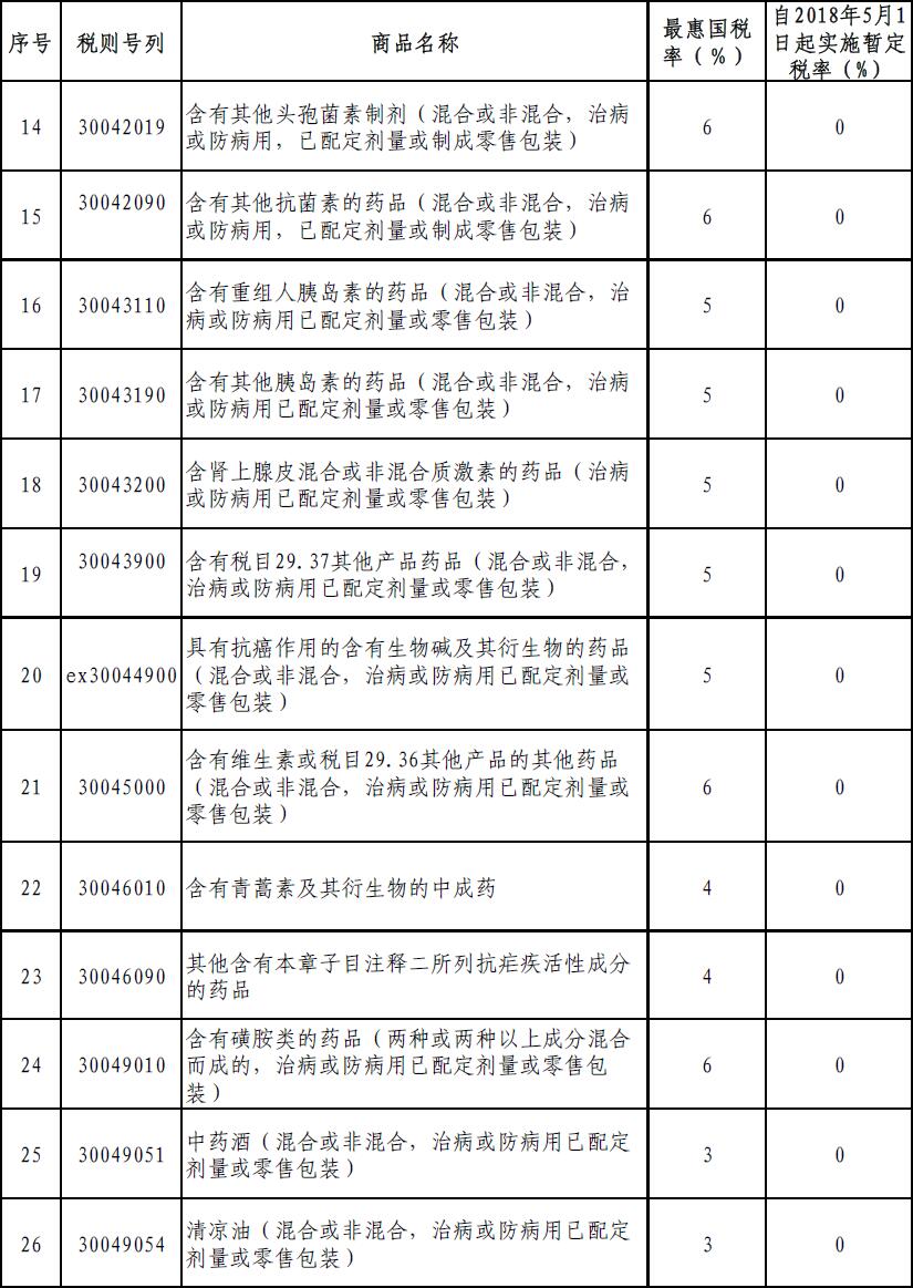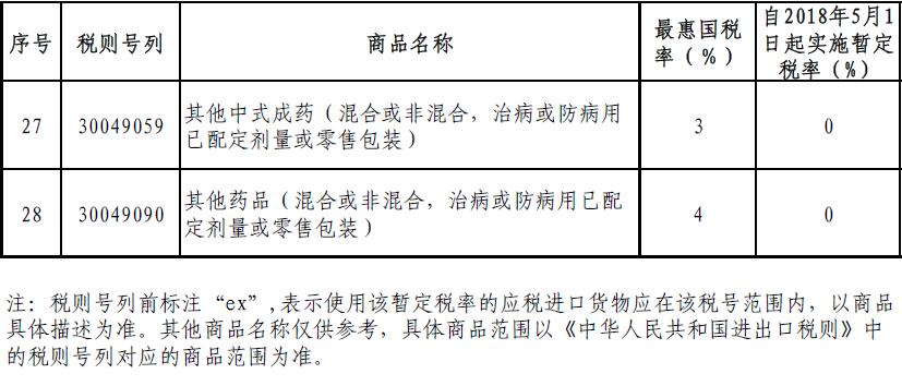 《公告》指出,根据《中华人民共和国进出口关税条例》相关规定,为减轻广大患者特别是癌症患者药费负担并有更多用药选择,自2018年5月1日起,以暂定税率方式将包括抗癌药在内的所有普通药品、具有抗癌作用的生物碱类药品及有实际进口的中成药进口关税降为零。