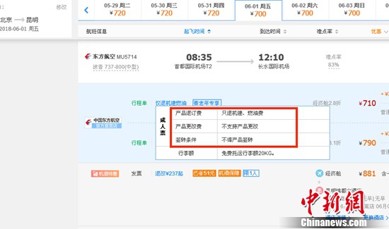记者在携程网上预订6月1日北京到昆明的东方航空MU5714票价为710元(2.8折),显示“只退机建、燃油费”“不支持产品更改”。