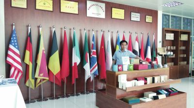 总经理袁利人在产品展示厅介绍海外市场情况。