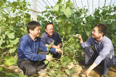 为进一步巩固和加强基层党组织建设,打赢脱贫攻坚战,今年以来,山东临邑县选派120名优秀年轻干部驻村帮扶,实行乡镇考勤、村里办公,建立健全县、乡、村三级扶贫网格。驻村干部精准制定扶贫方案,推进基层组织转化升级,推动社区(村)脱贫致富。图为日前,派驻临盘街道前杨村驻村干部崔磊(右一)在扶贫产业园了解果蔬种植情况。 3eW安康新闻网