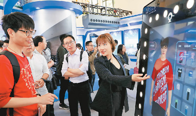 图为工作人员(右一)指导参观者使用一款互联网智能试衣镜。