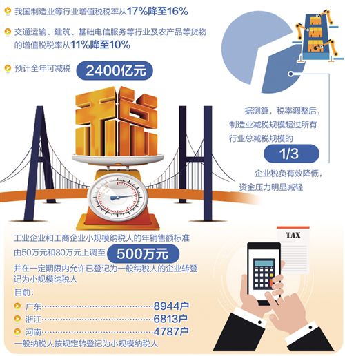 从5月1日起,我国制造业等行业增值税税率从17%降至16%,交通运输、建筑、基础电信服务等行业及农产品等货物的增值税税率从11%降至10%,预计全年可减税2400亿元。4ja安康新闻网