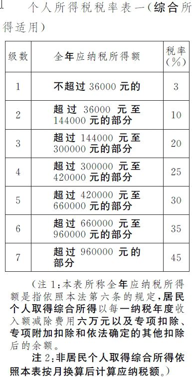 根据新税率表,综合所得应该按如下税率缴税:全年应纳税所得额不超过36000元的为3%;超过36000元至144000元的部分为10%;超过144000元至300000元的部分为20%;超过300000元至420000元的部分为25%;超过420000元至660000元的部分为30%;超过660000元至960000元的部分为35%;超过960000元的部分为45%。