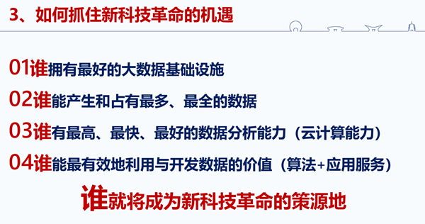 这一次新的科技革命,谁成为它的策源地,谁就会成为科技强国,这个也是十九大习近平总书记给我们提出的要求,到2050年中国要成为科技强国。要想成为科技策源地主要的竞争将会在四个层面展开:第一,谁拥有最好的大数据基础设施;第二,谁能产生和占有最多、最全的数据;第三,谁有最高、最快、最好的数据分析能力;第四,谁能最有效地利用与开发数据的价值,假如在这四个层面我们全可以领先世界,我们就是新的科技革命的策源地。
