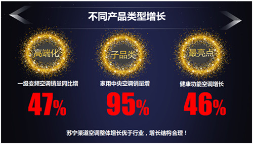 苏宁易购大数据平台显示,产品结构变化的方向有三:一、高端化趋势如一级变频空调销量同比增47%;其二、以家用中央空调为代表的子品类销量增长95%;其三、功能趋势最大亮点,健康功能空调增长46%。