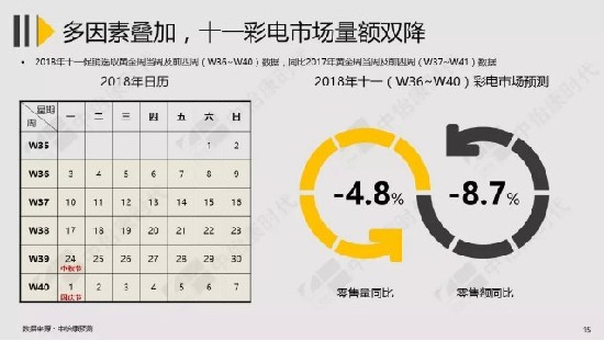 中怡康预测,今年十一彩电市场或呈现“量额双降”局面,其中零售量同比下降4.8%,零售额则同比下降8.7%,长假对彩电行业所起的作用将小于预期。分析原因主要有两点:一是每年促销节点太多,消费者应接不暇;二是新兴营销模式层出不穷,造成消费分流。