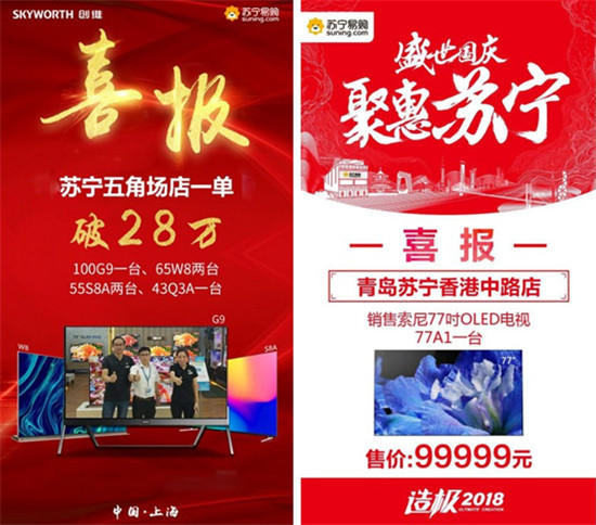 消费升级趋势下,越来越多的消费者倾向于购买提升品质生活的家电产品。而彩电作为客厅娱乐的重头戏,表现尤其明显。代表未来显示技术的OLED电视,QLED量子点电视在这个国庆,都受到了消费者的热烈追捧。上海苏宁五角广场店开出了一笔超28万元的彩电大单,客户顾先生一口气买下了188888元的创维百吋电视100G9、39999元的创维OLED电视65W8、11999元的创维OLED电视55S8A及创维43Q3A共计四台电视。青岛香港中路店则售出了售价99999元的索尼OLED电视77A1。
