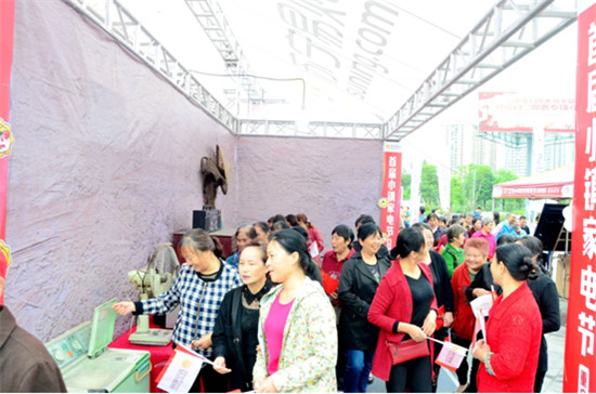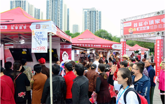 在重庆湖溪镇的家电购物节现场的“家电博物馆”,展出了70年代“三转一响”(自行车、缝纫机、手表和收音机),80、90年代“三大件儿”(电视机、冰箱、洗衣机)以及10年代的“新三大件儿”(洗碗机、净化器、扫地机器人)等,10月1日一大早就引来众多居民纷纷围观,不少阿姨们驻足在70年代展区,对展出的双杠洗衣机、缝纫机、收音机津津乐道,兴奋地凑近看看、拍几张照片。