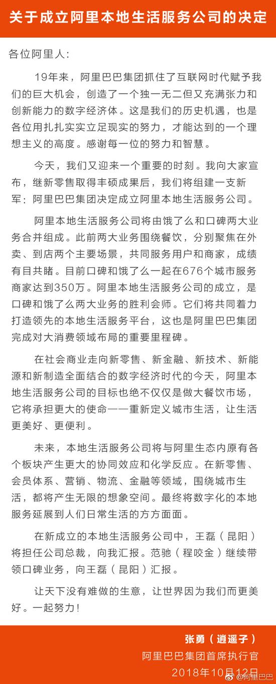 据悉,阿里巴巴集团合伙人王磊(花名昆阳)将担任阿里本地生活服务公司总裁,向阿里集团CEO张勇汇报,并兼任饿了么CEO;阿里巴巴集团副总裁范驰(花名程咬金)将继续带领口碑业务,向王磊汇报。