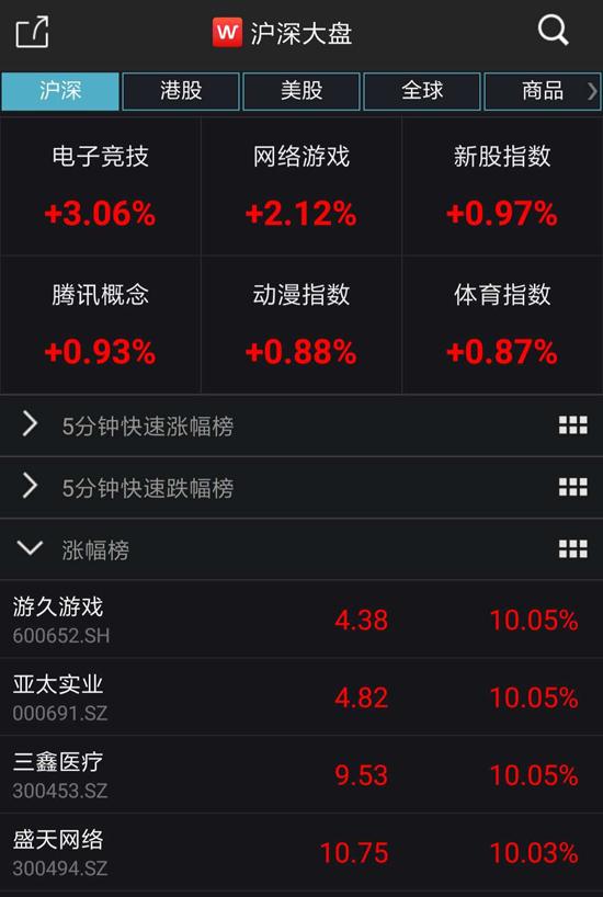 在消息发出后,游戏板块集体爆发。从A股方面来看,截至周五(11月21日)收盘,在大盘整体低迷下跌0.79%的背景下,Wind电子竞技指数和网络游戏指数两大概念板块逆势上攻,截至收盘分别上涨3.06%与2.12%,其中,游久游戏、盛天网络、游族网络、中青宝等涨停,完美世界上涨超6%,昆仑万维上涨近3%。