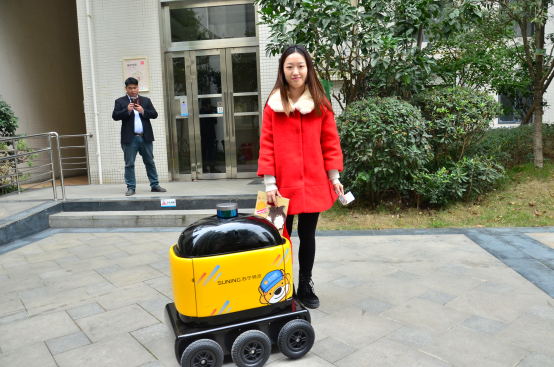 家住蓝润锦江春天8栋的许小姐,下午在苏宁小店APP下单购买了一袋零食大礼包,短信提醒商品已由无人车送到楼下。这时许小姐下楼看到单元门前等候的无人车,点击手机短信,轻松就取出了大礼包。第一次收到无人车送来的商品,许小姐表示,“没想到这个看起来像个玩具一样的无人车,十几分钟就给我送来了零食,还说话提醒我帮它关好门,很聪明嘛。”
