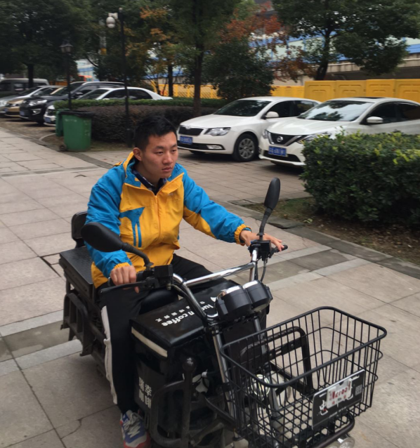 潘俊赶忙将咖啡放到门卫室,跑过去搀扶生病的学生。考虑到送学生去最近的医院也要有一段时间,潘俊在保安的帮助下,将生病男生抱上快递车,一路骑车将其送到了医院。